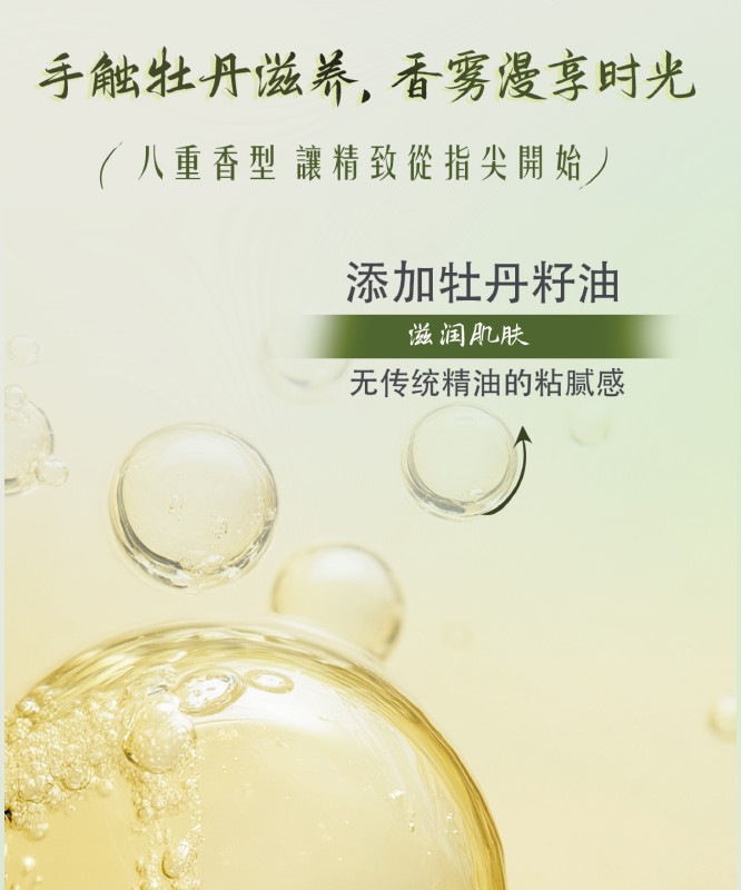 香味 Fragrance 淡雅清新的天然牡丹花香,略带草本气息,无人工香精。