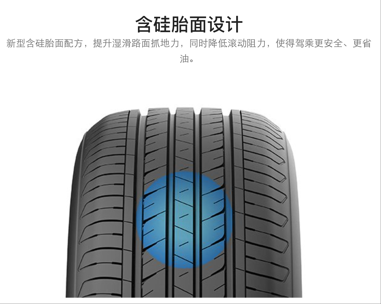 新型含硅胎面配方,提升湿滑路面抓地力,同时降低滚动阻力,使得驾乘更安全、更省油。