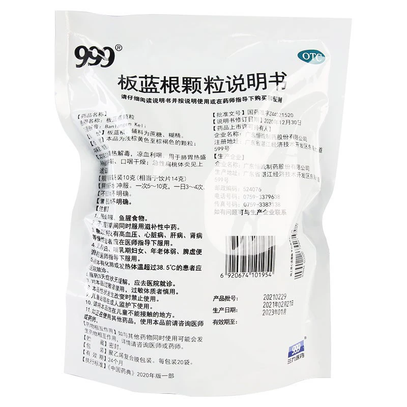 999 板蓝根颗粒20袋清热解毒凉血利咽咽喉肿痛口咽干急性扁桃体炎