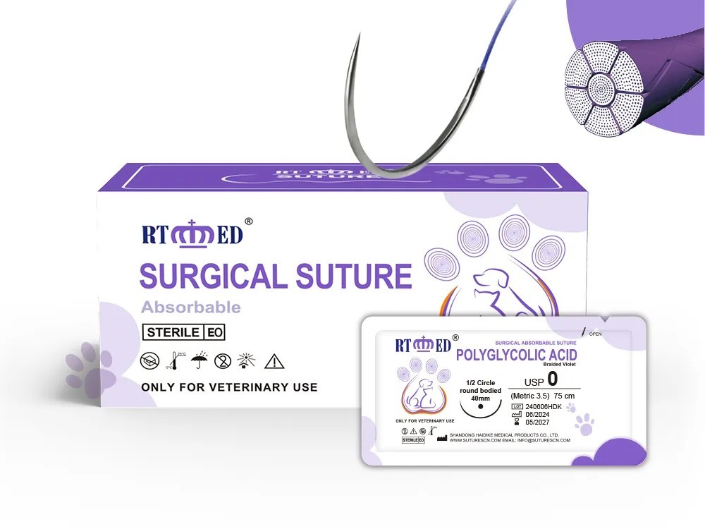 PGA absorbable sutures are braided surgical sutures made from polyglycolic acid fibers, offering minimal tissue reaction and eliminating the need for removal, as they fully absorb within approximately 90 days. Our sutures are coated with polycaprolactone and calcium stearate, ensuring smooth passage through tissue and meeting USP and European Pharmacopoeia standards. The needles are made from high-quality stainless steel with laser-drilled holes and offer excellent sharpness, elasticity, and toughness, providing reliable performance in surgical procedures.
